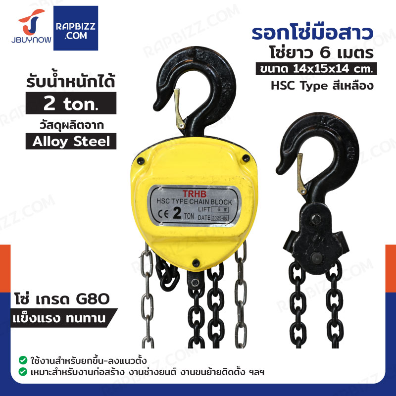 TRHB รอกโซ่มือสาว รอกสามเหลี่ยม 2 ตัน โซ่ยาว 6 เมตร HSC Type สีเหลือง