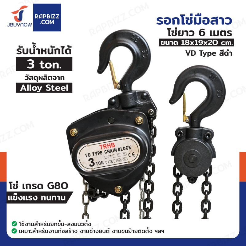 TRHB รอกโซ่มือสาว รอกสามเหลี่ยม 3 ตัน โซ่ยาว 6 เมตร VD Type สีดำ