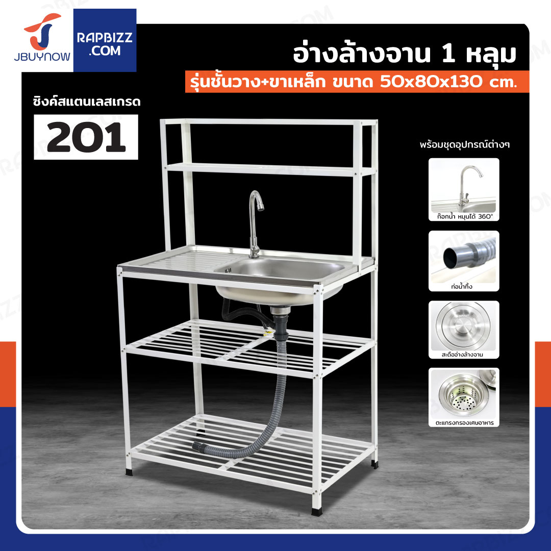 ซิงค์สแตนเลส 201 อ่างล้างจาน 1 หลุม รุ่นชั้นวาง+ขาเหล็ก 50x80x130 cm