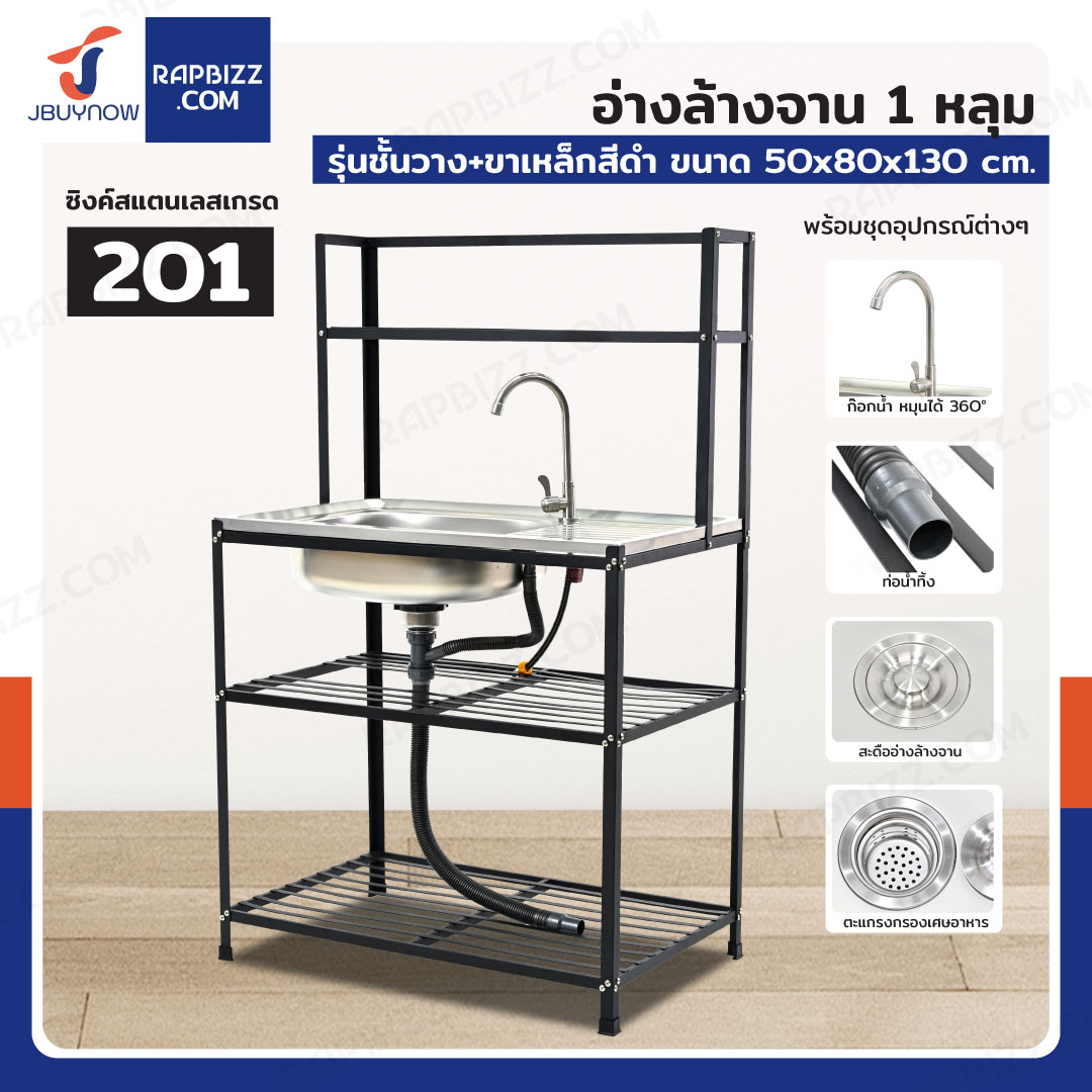 ซิงค์สแตนเลส 201 อ่างล้างจาน 1 หลุม รุ่นชั้นวาง+ขาเหล็กสีดำ 50x80x130 cm