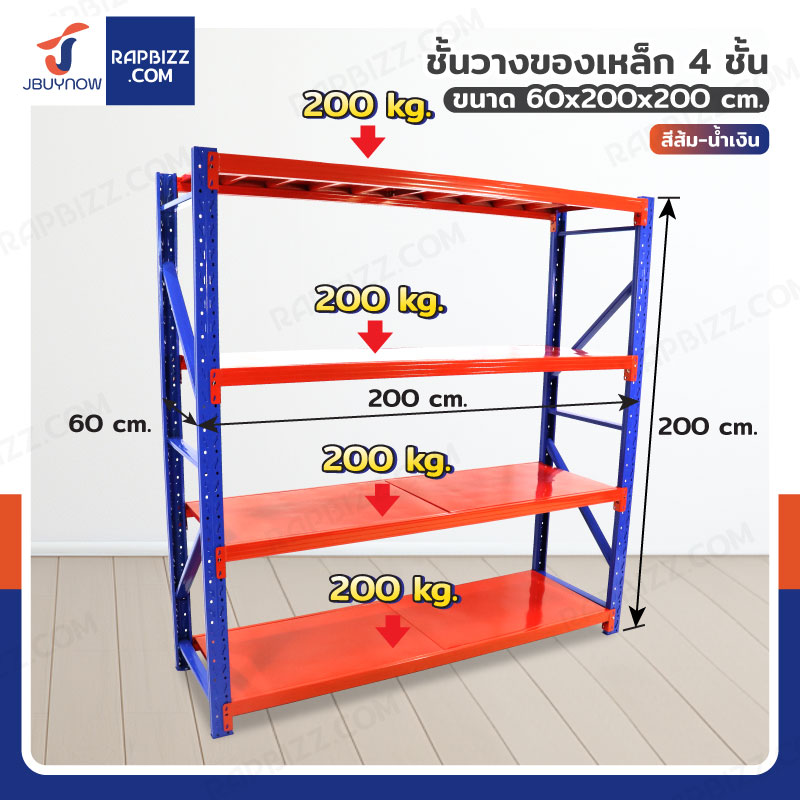 ชั้นวางของ 4 ชั้น 60x200x200 cm สีส้ม-น้ำเงิน รับน้ำหนัก 200 kg รุ่น ขาเชื่อม