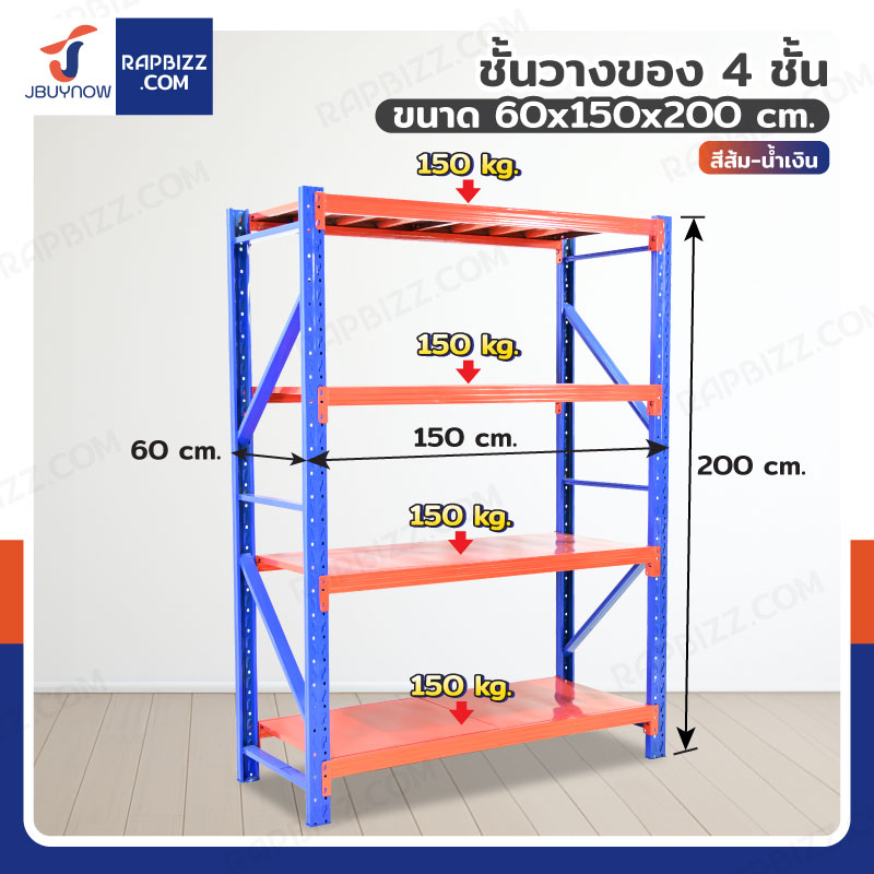 ชั้นวางของ 4 ชั้น 60x150x200 cm สีส้ม-น้ำเงิน รับน้ำหนัก 150 kg รุ่นขาเชื่อม