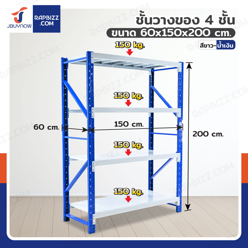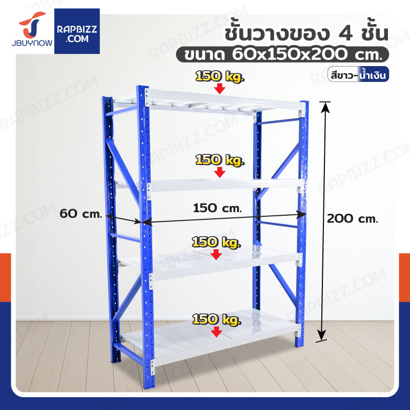 ชั้นวางของ 4 ชั้น 60x150x200 cm สีขาว-น้ำเงิน รับน้ำหนัก 150 kg รุ่นขาเชื่อม