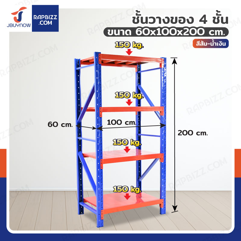 ชั้นวางของ 4 ชั้น 60x100x200 cm สีส้ม-น้ำเงิน รับน้ำหนัก 150 kg รุ่นขาเชื่อม