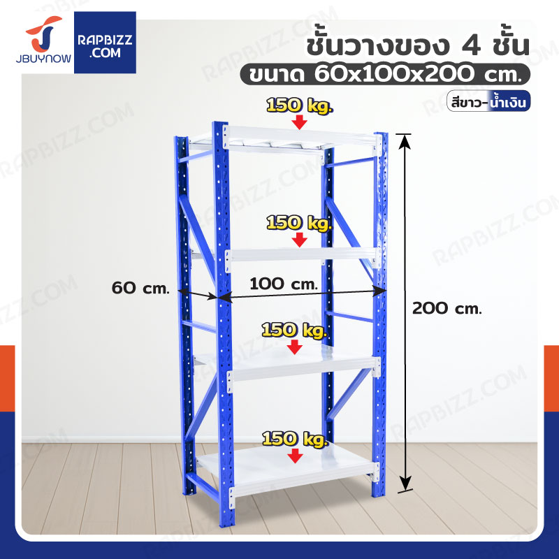 ชั้นวางของ 4 ชั้น 60x100x200 cm สีขาว-น้ำเงิน รับน้ำหนัก 150 kg รุ่นขาเชื่อม