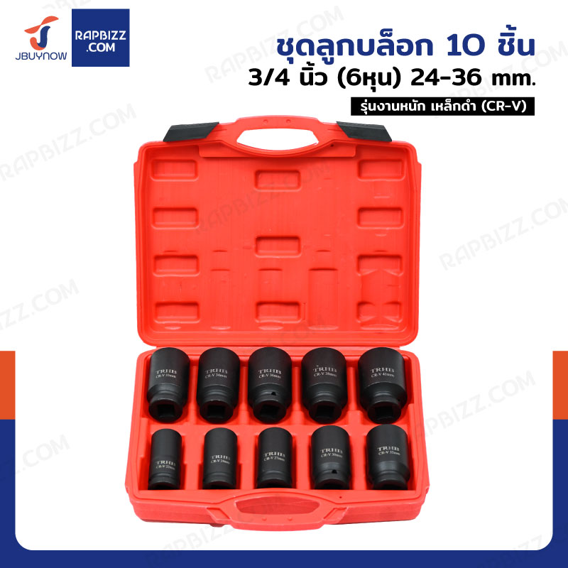 ชุดลูกบล็อก 10 ชิ้น 3/4 นิ้ว (6 หุน) 24-36MM งานหนัก เหล็ก ดำ CR-V Zx-TZGJ002-1