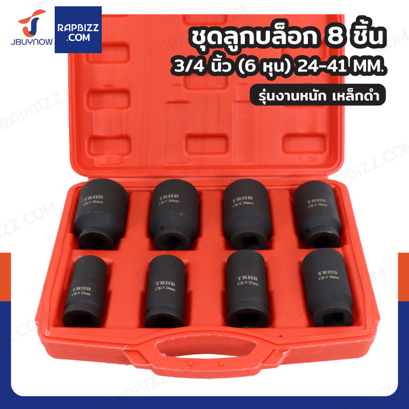 ชุดลูกบล็อก 8 ชิ้น 3/4 นิ้ว (6 หุน) 22-41 MM งานหนัก เหล็ก ดำ