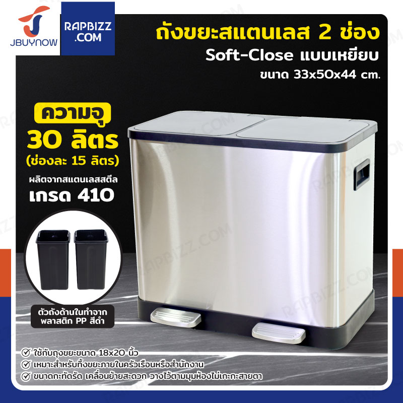 ถังขยะสแตนเลส 2 ช่อง แบบเหยียบ ทรงเหลี่ยม 30 ลิตร (ช่องละ 15 ลิตร) 33x50x44 cm