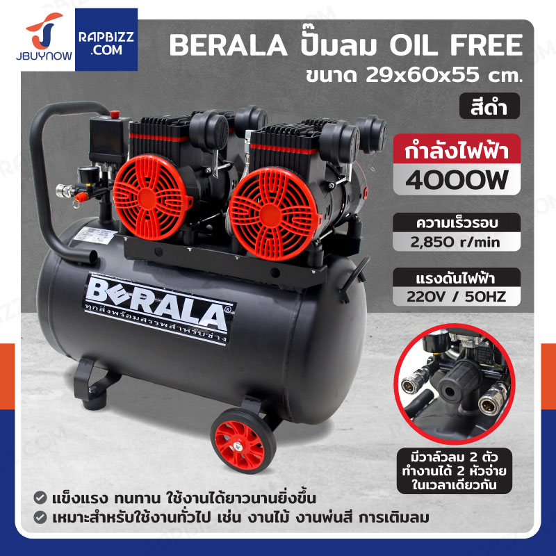BERALA ปั๊มลม OIL FREE 50 ลิตร 4000W สีดำ