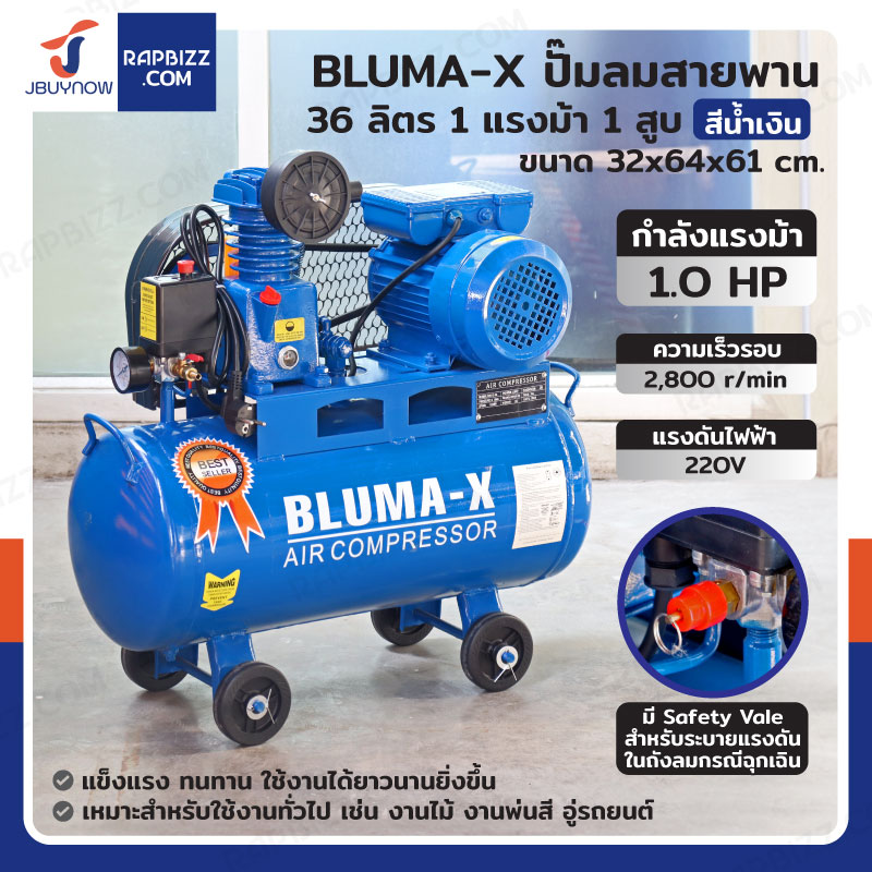 BLUMA-X ปั๊มลมสายพาน 36 ลิตร 1แรงม้า 1สูบ สีน้ำเงิน