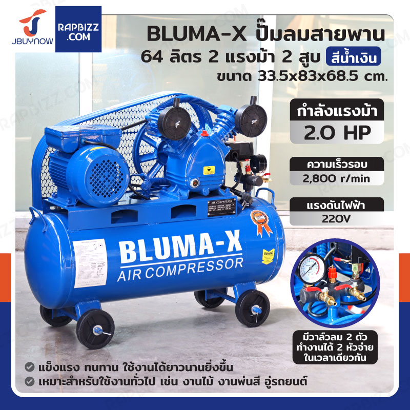 BLUMA-X ปั๊มลมสายพาน 64 ลิตร 2แรงม้า 2สูบ สีน้ำเงิน