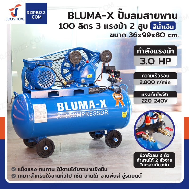 BLUMA-X ปั๊มลมสายพาน 100 ลิตร 3แรงม้า 2สูบ สีน้ำเงิน