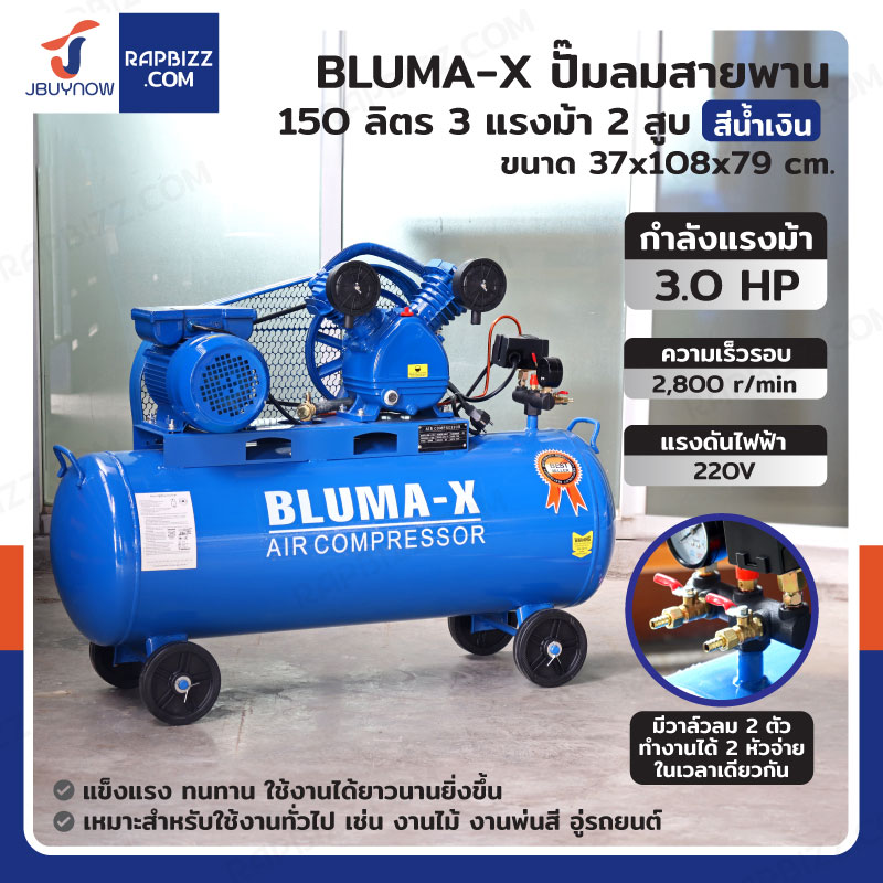 BLUMA-X ปั๊มลมสายพาน 150 ลิตร 3แรงม้า 2สูบ สีน้ำเงิน
