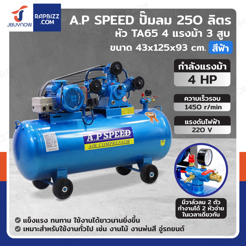 A.P SPEED ปั๊มลม 250 ลิตร หัว TA65 4แรงม้า 3สูบ สีฟ้า