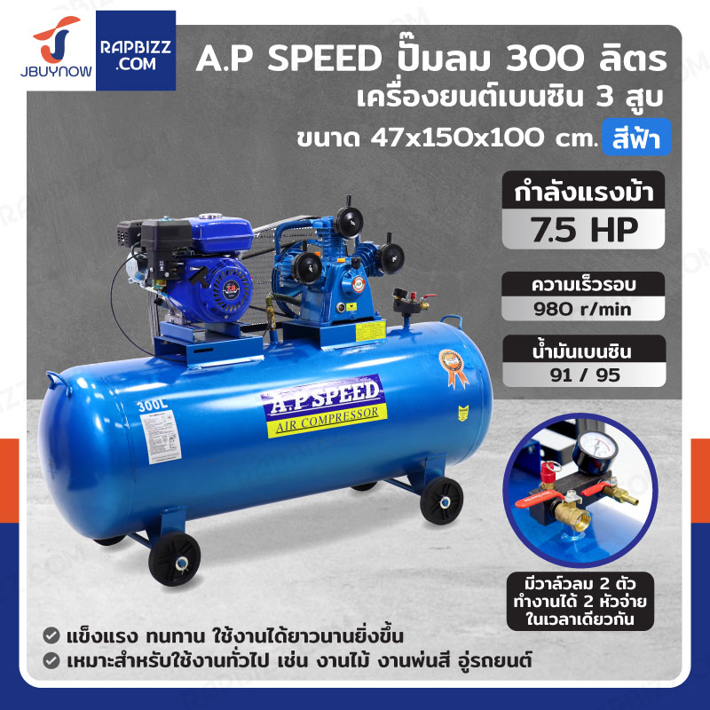 A.P SPEED ปั๊มลม 300 ลิตร เครื่องยนต์เบนซิน 7.5แรงม้า 3สูบ สีฟ้า