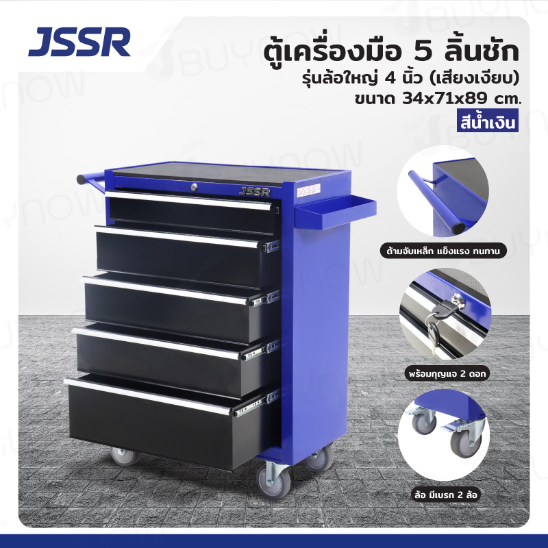 JSSR ตู้เครื่องมือ 5 ลิ้นชัก มีกุญแจล็อค 34x71x89 CM สีน้ำเงิน รุ่นล้อใหญ่ 4 นิ้ว (เสียงเงียบ)