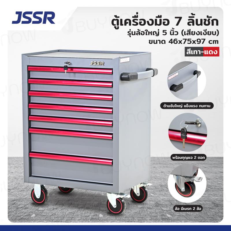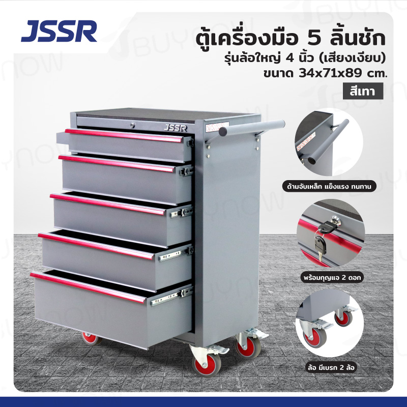 JSSR ตู้เครื่องมือ 5 ลิ้นชัก มีกุญแจล็อค 34x71x89 CM สีเทา รุ่นล้อใหญ่ 4 นิ้ว (เสียงเงียบ)