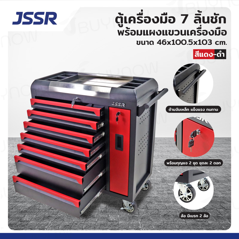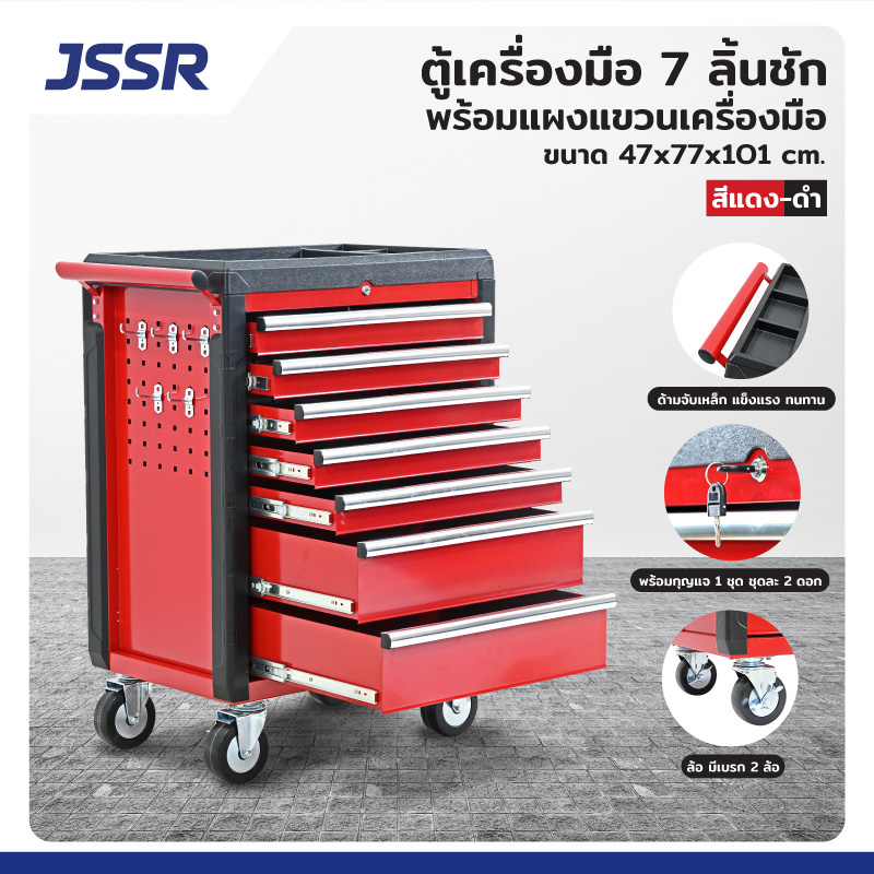 JSSR ตู้เก็บเครื่องมือรถเข็น 7 ลิ้นชัก พร้อมแผงแขวนเครื่องมือ 47x77x101 CM สีแดง-ดำ TT-3007