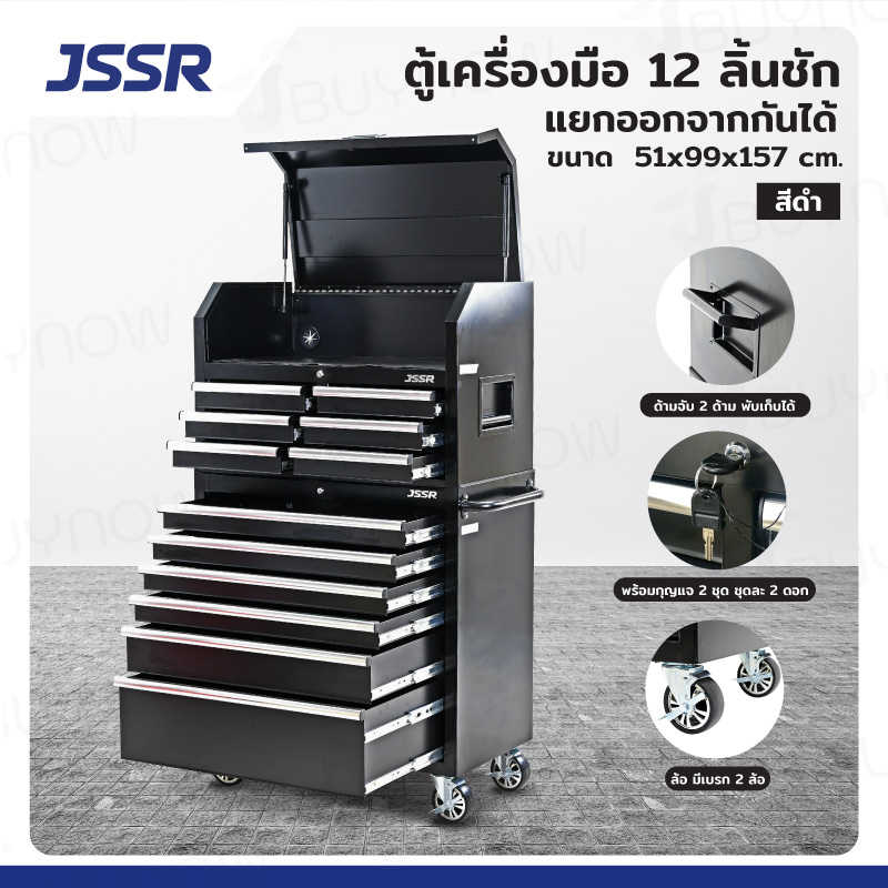 JSSR ตู้เก็บเครื่องมือรถเข็น 12 ลิ้นชัก 51x91x157CM แยกออกจากกันได้ สีดำ TC-3606