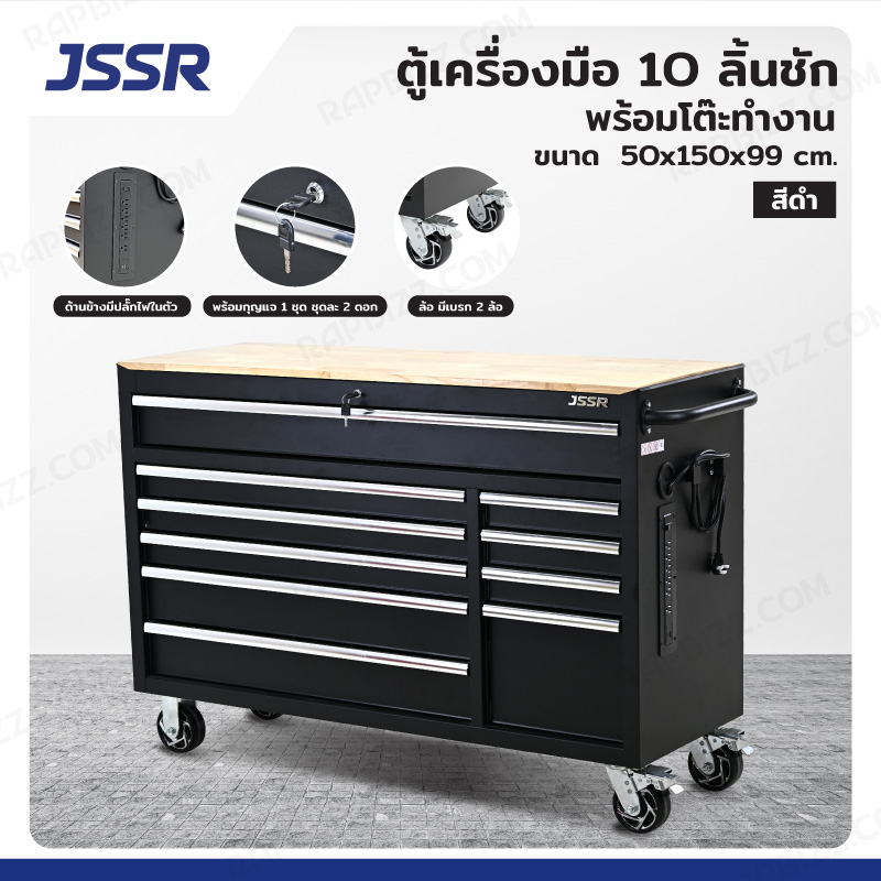 JSSR ตู้เครื่องมือ 10 ลิ้นชัก มีกุญแจล็อค พร้อมโต้ะทำงาน 50x150x99 cm สีดำ TT-5610