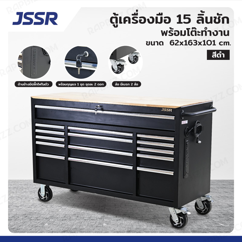 JSSR ตู้เครื่องมือ 15 ลิ้นชัก มีกุญแจล็อค พร้อมโต้ะทำงาน 62x163x101 cm สีดำ TT-6115
