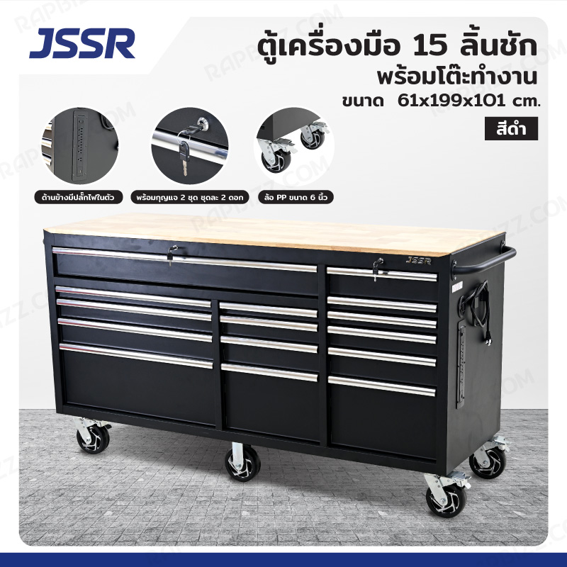 JSSR ตู้เครื่องมือ 15 ลิ้นชัก มีกุญแจล็อค พร้อมโต้ะทำงาน 61x199x101 cm สีดำ TT-7215